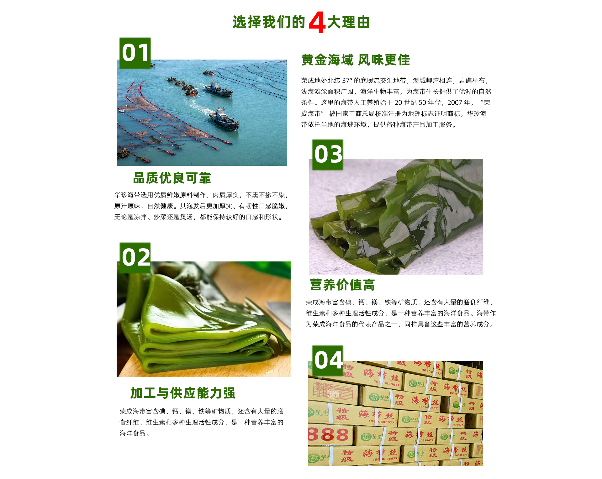 荣成市俚岛镇华珍海带加工厂成立于1993年,位于山东省荣成市俚岛镇,是一家专注于海带种植与深加工的专业企业。公司依托北纬37度的海域资源,形成了从育苗、养殖到加工的完整产业链。产品线涵盖干海带、海带丝、海带结、海带片、盐渍海带、裙带菜等十余个品类,其中华珍海带片与海带花系列因藻体厚实、胶质浓郁而广受市场好评。企业始终坚持绿色养殖理念,产品远销华北、西南等地。